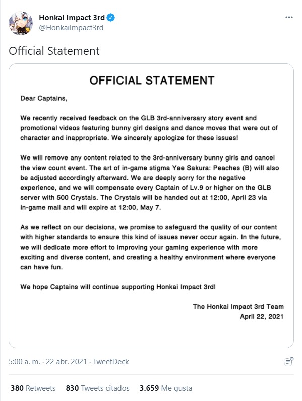 Por su parte, la desarrolladora miHoYo lanzó un comunicado en Twitter para dar una explicación sobre la eliminación del contenido referente a las conejitas.