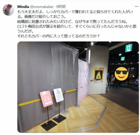 Cuando fui a comprobar hace unos días, me encontré con que gracias a una queja, se habían colocado unas cortinas que cubrían la entrada, de modo que sólo se puede acceder por una pequeña puerta ubicada en el lado contrario. Y por alguna razón, ¡Sólo se había eliminado la ilustración que se publicó en el tweet original!