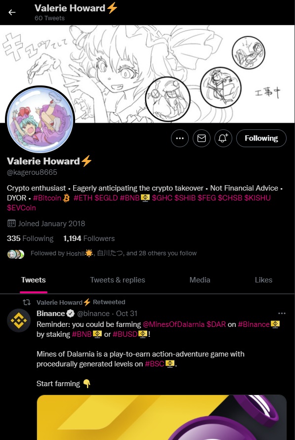Mira un ejemplo. Esta cuenta era obviamente de una persona japonesa que realmente amaba dibujar a Remilia, pero ahora publica en inglés y está promocionando nada más que criptomonedas. Una de las últimas publicaciones que les quedan también está en japonés.