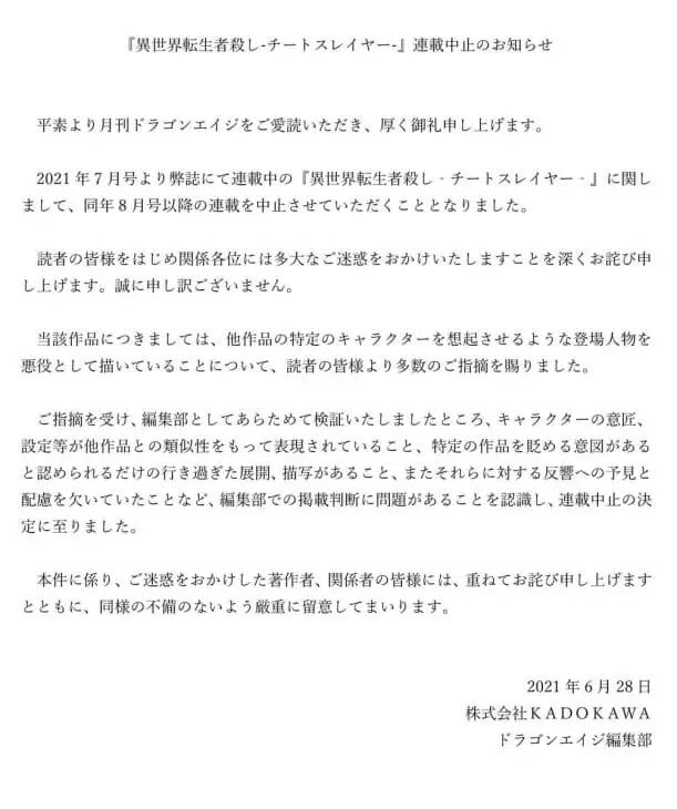 Resulta que después de estrenarse el primer capítulo, el departamento editorial de la revista Dragon Age realizó un análisis en la que descubrió que el manga «plagiaba a otras franquicias populares», ya que utilizaba personajes muy similares a otras obras isekai.