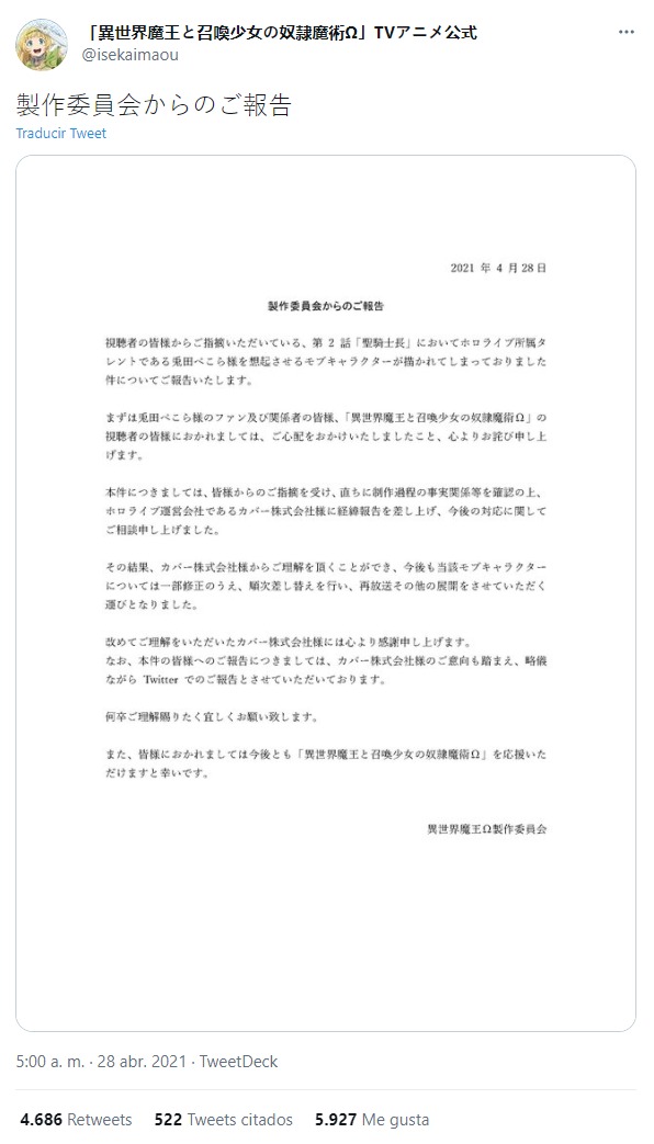 Mediante la cuenta oficial en Twitter para el anime Isekai Maou to Shoukan Shoujo no Dorei Majutsu, se publicó un comunicado pidiendo disculpas por la referencia a la Vtuber Usada Pekora en el segundo episodio de la segunda temporada del anime.