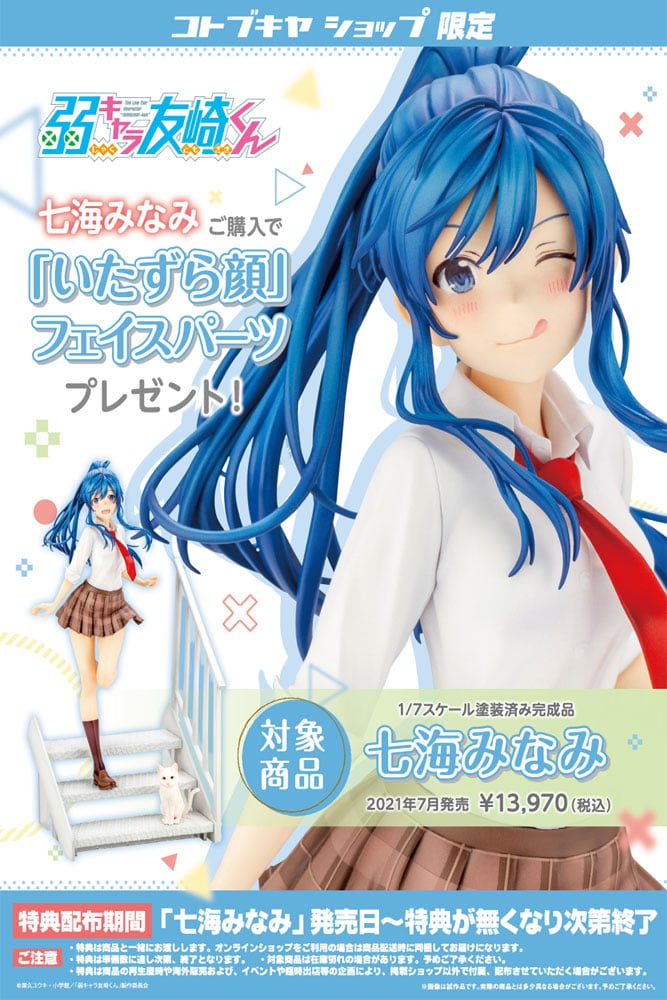A través de su sitio web, la compañía Kotobukiya ha revelado una figura a escala 1/7 inspirada en el personaje Minami Nanami del anime Jaku-Chara Tomozaki-Kun (Bottom-Tier Character Tomozaki). Esta figura se lanzará a la venta el próximo mes de julio de 2021.