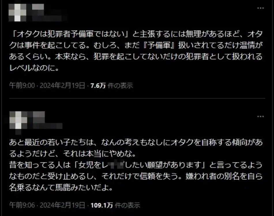 En el foro japonés «Otakomu» una entrada ha causado mucha indignación entre los fans nipones, pues en ella se abre debate sobre una reciente publicación en X de una chica aparentemente feminista carga contra los otakus llamándolos criminales y potenciales agresores. En la publicación se lee lo siguiente: «Los otakus cometen tantos crímenes que no sería razonable afirmar que no son criminales potenciales. De hecho, todavía los tratan como «reservistas» (Fuerzas de Autodefensa de Japón). En circunstancias normales deberían ser tratados como un criminal que no ha cometido ningún delito aún».