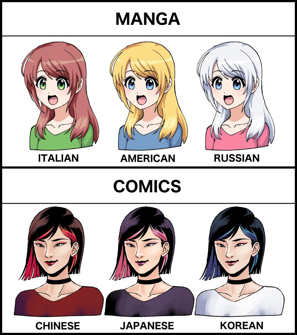 A través de su cuenta de Twitter, @Byackopath mostró una primera imagen comparativa en la que en la parte superior dibujó tres personajes al estilo manga de nacionalidades italiana, estadounidense y rusa, con el común de que las tres lucían ojos claros y el cabello rubio, pero en tonalidades más claras, según la nacionalidad representada.