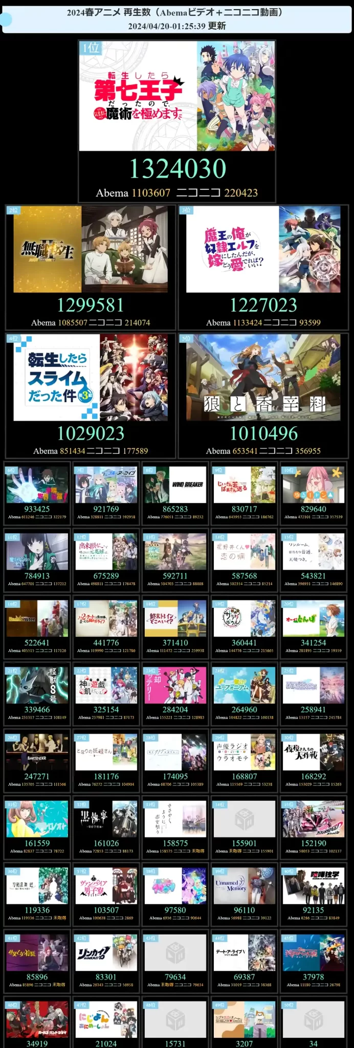 La segunda mitad de este top empieza con el número #6.— «KONOSUBA -God’s Blessing on This Wonderful World! 3» con 933 mil y 425 reproducciones. #7.— «Blue Archive The Animation» con 921 mil 769 reproducciones totales. #8.— «WIND BREAKER» con 865 mil 283 reproducciones. #9.— «Grandpa and Grandma Turn Young Again» con 830 mil 717 reproducciones, finalmente el puesto #10.— «Laid-Back Camp Season 3» con 829 mil 640 reproducciones totales en «AMEBA» y «niconico» dentro del territorio de Japón.