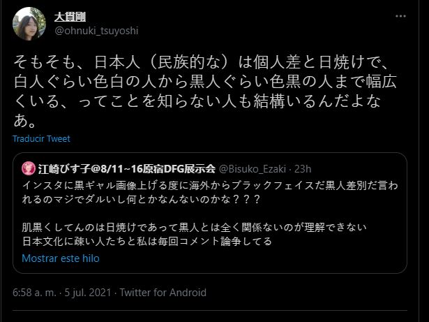 Siempre estoy discutiendo con gente que no está familiarizada con la cultura japonesa porque es un bronceado que me oscurece y entiendo que no tiene nada que ver con los negros.