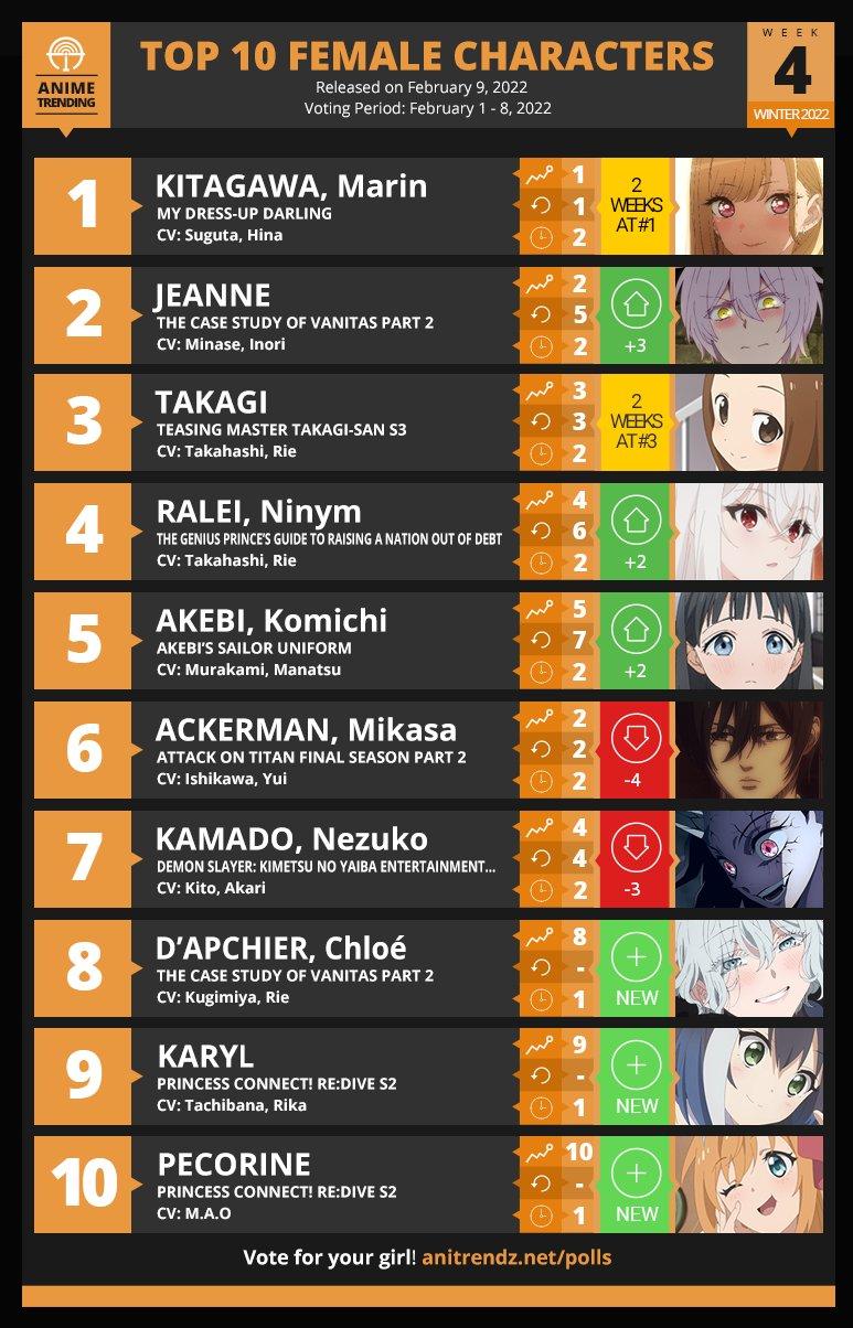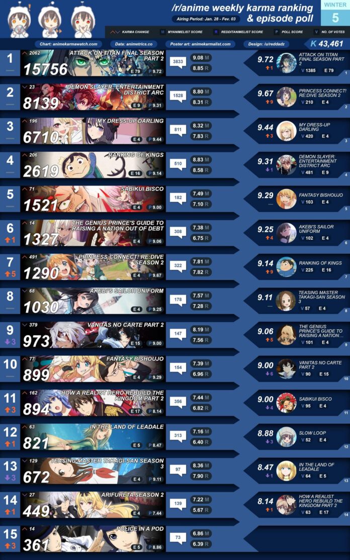 Hoy en dรญa, existen varios sitios web que realizan encuestas semanales para ver que anime y personajes son los mรกs populares de los รบltimos 7 dรญas. De esta manera, los japoneses reaccionaron a los rankings en Reddit y Anime Trending. Primero tenemos al ranking de Reddit de โ€œKarma y Poll Rankingโ€ el cual nos muestra que la serie obtuvo la tercera posiciรณn en la quinta semana de la temporada invierno 2022.