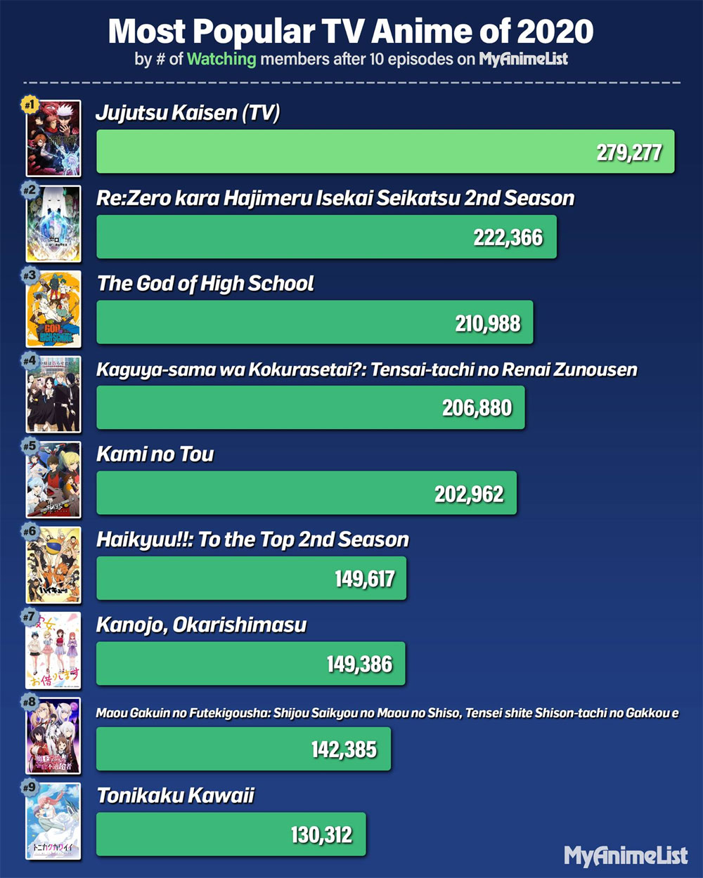 En la lista podemos ver como detrás de Jujutsu Kaisen se encuentra en segundo puesto la segunda temporada de Re:Zero (222.366 votos), en tercer puesto The God of Highschool (210.988 votos) y en el cuarto puesto se posiciona la segunda temporada de Kaguya-Sama: Love is War (208.880 votos).
