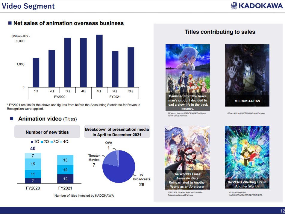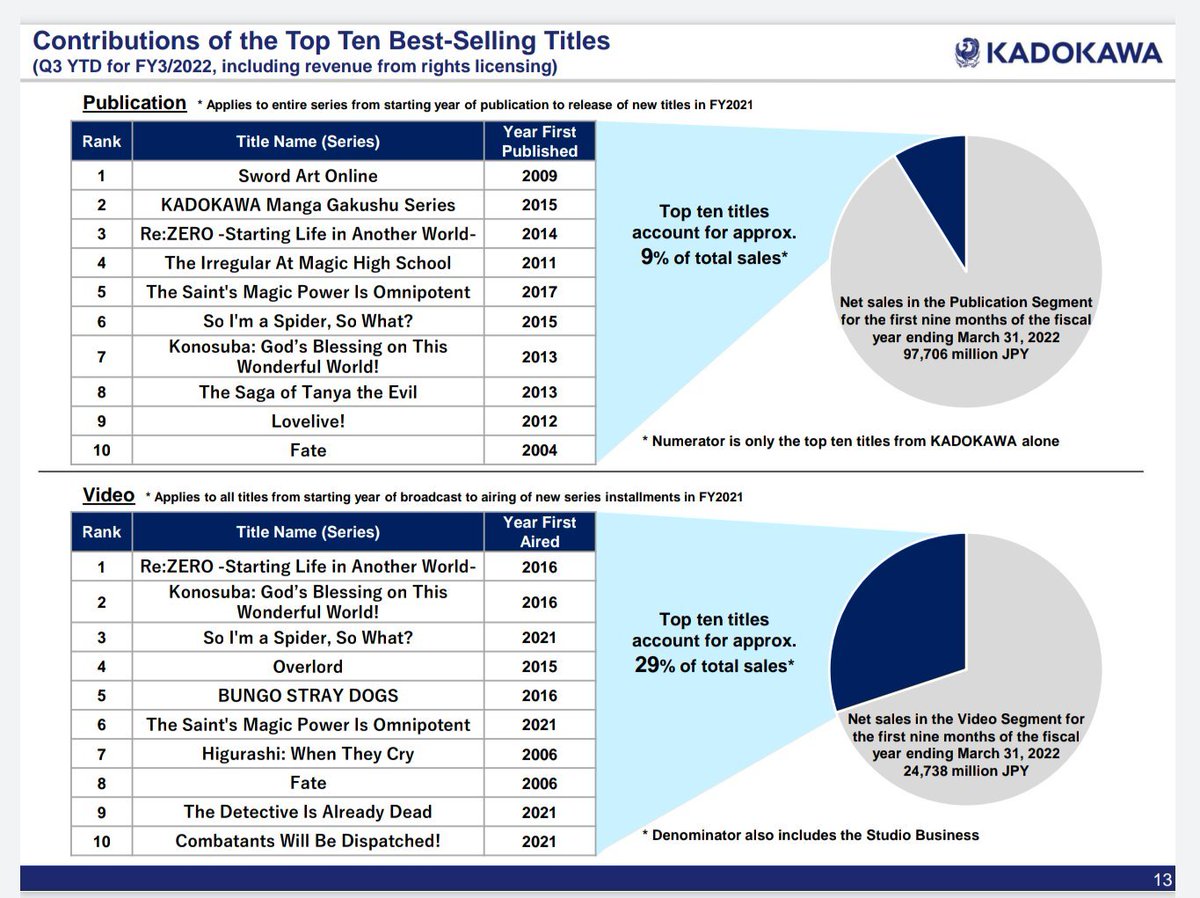 Por รบltimo, tenemos los 10 animes que mรกs se vendieron a nivel mundial durante el tercer trimestre del 2021, los cuales representan el 29% de las ventas totales de Kadokawa. En esta se muestra que los primeros 4 puestos son isekai, por lo que Kadokawa podrรญa seguir invirtiendo en ellos en un futuro. Cabe resaltar, que de los animes mencionados Konosuba, Overlord, Bungou Stray Dogs y Fate ya tiene un nuevo proyecto animado anunciado.