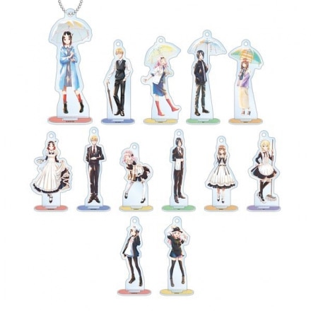 En el caso de los llaveros acrílicos, se encuentra disponible por caja con 13 modelos diferentes de 83 mm de alto y un precio de 11 440 yenes, que incluye modelos de diferentes personajes del anime.