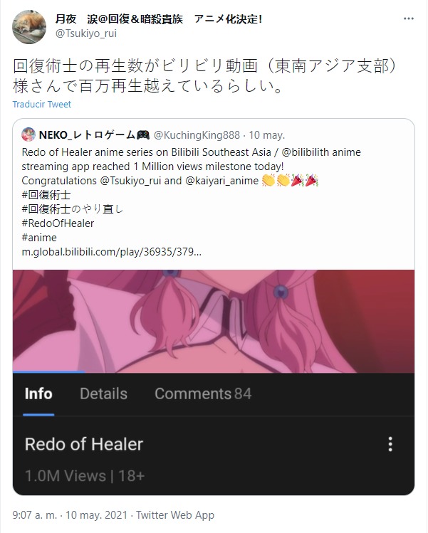 Mediante su cuenta oficial en Twitter, Rui Tsukiyo, el autor de Kaifuku Jutsushi no Yarinaoshi (Redo of Healer), compartió una publicación donde se felicitaba al anime por haber conseguido superar el millón de reproducciones en la plataforma Bilibili en la región del sudeste asiático.