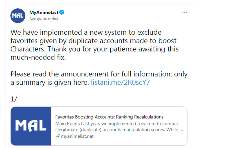 El día de ayer, el Twitter oficial de My Anime List, ha dado un comunicado anunciando una nueva actualización en el sistema de votos, logrando así la eliminación de los votos duplicados de la plataforma a la hora de votar en sus encuestas, puntajes, etc.