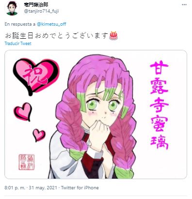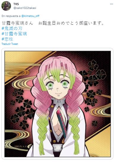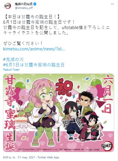 Mediante la cuenta oficial en Twitter del anime Kimetsu no Yaiba (Demon Slayer), se publicó una ilustración especial para conmemorar el cumpleaños del personaje Mitsuri Kanroji, el cumpleaños del personaje se celebra el 1 de junio en Japón.