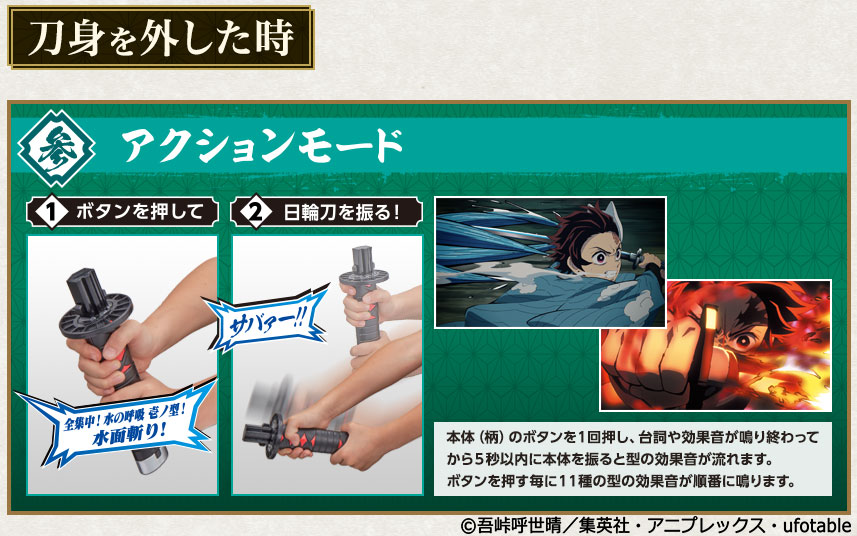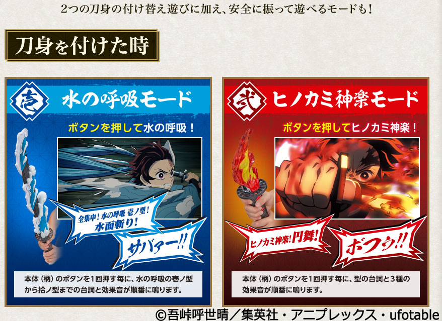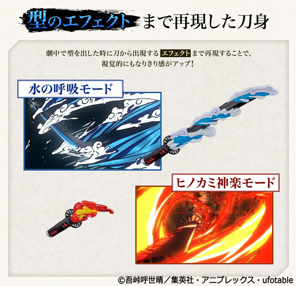 El juguete es una recreación de las Nichirin Blades que aparecen en la serie, cuenta con dos accesorios diferentes e intercambiables para poder tener ya sea una espada de agua o una de fuego y además, la espada tiene 50 lineas y efectos de sonido diferentes.