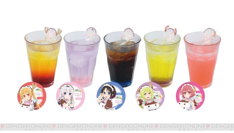 En total son 5 bebidas especiales, cada una con el nombre y los colores de las dragonas del anime.