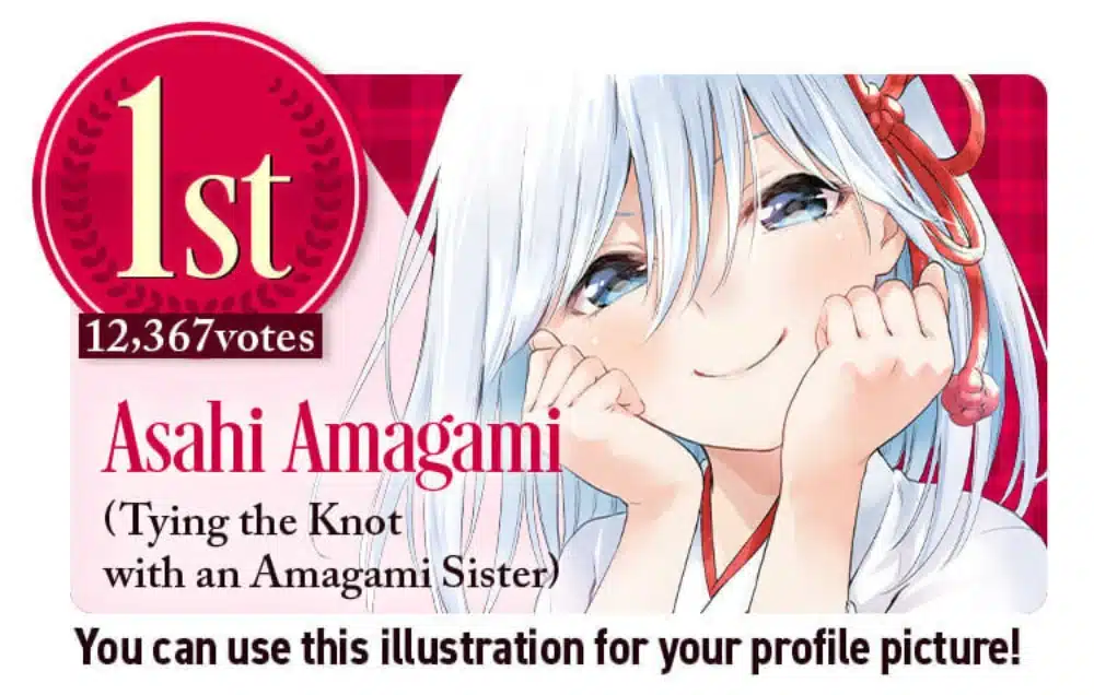 Con un impresionante total de 12,367 votos, Asahi es una de las tres hermanas Amagami, y se caracteriza por su fuerte determinación y carácter directo, a pesar de su actitud ruda, tiene un lado tierno y protector, lo que ha conquistado a los lectores. En este manga, un joven estudiante llamado Uryuu Kamihate, que aspira a ingresar a la Universidad de Medicina de Kioto, termina viviendo en un santuario junto a tres hermanas: las Amagami, pronto se le informa que debe casarse con una de ellas para poder heredar el santuario, lo que da inicio a una historia de enredos y romance.