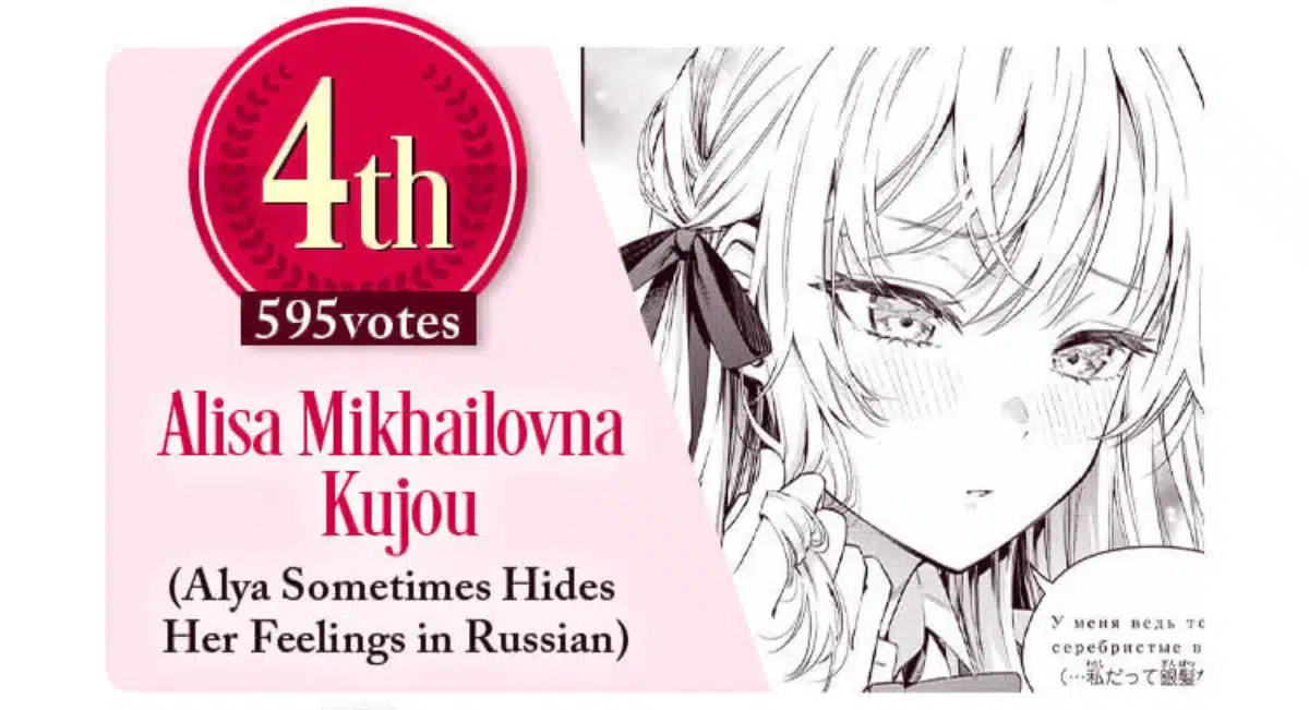 Con 595 votos. Alisa es una estudiante de origen ruso con una personalidad distante y elegante, pero que a menudo deja escapar dulces comentarios en su idioma natal, su dualidad entre frialdad y ternura la ha convertido en una de las favoritas del género. La historia sigue a Masachika Kuze, un estudiante japonés algo perezoso que se sienta junto a Alisa (Alya) Kujou, una hermosa y talentosa estudiante de ascendencia rusa, aunque parece indiferente hacia él, Alya suele murmurar frases cariñosas en ruso, sin saber que Masachika puede entenderlas.