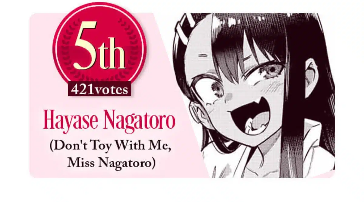 Con un total de 421 votos. Nagatoro es conocida por su actitud juguetona y provocadora hacia el protagonista, pero también muestra un desarrollo emocional notable a lo largo de la historia, ganándose el corazón de los lectores. La historia gira en torno a Naoto Hachiouji, un estudiante introvertido que pasa la mayor parte de su tiempo en la sala de arte de la escuela, un día, la alegre y un poco sádica Hayase Nagatoro comienza a molestarlo constantemente, pero con el tiempo, la relación entre ellos evoluciona, revelando un lado más tierno de la protagonista.