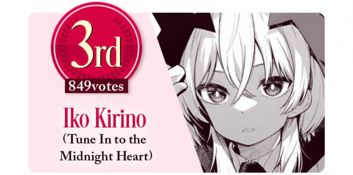 Con 849 votos, Iko es una chica enigmática y reservada, cuyo mundo cambia cuando se involucra en un programa de radio nocturno, su crecimiento como personaje y la forma en que enfrenta sus emociones han resonado profundamente con los fans. En esta historia, el protagonista, Arisu Yamabuki, se topa con un misterioso programa de radio conducido por una chica de su escuela llamada Iko Kirino, a medida que interactúan, se desarrolla un vínculo que les permite comprenderse y apoyarse mutuamente en sus problemas personales.