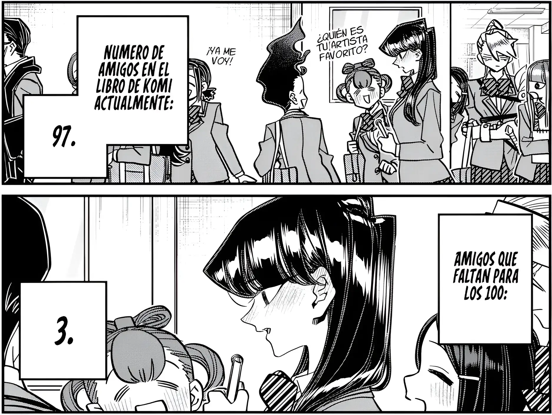 Como pudimos ver en el capítulo 458 del manga, Komi-san ha estado trabajando arduamente para manejar su problema de comunicación y la recompensa ha sido el tener 97 amigos. Sin embargo, parece ser que cada vez que está más cerca de cumplir su sueño, más difícil se vuelve, ya que tiene que convivir con más personas de las que tiene, y a pesar de que ella lleva un tiempo volviéndose más sociable, la situación parece alargarse aún más por ya casi ser amiga de la mayoría de su colegio.