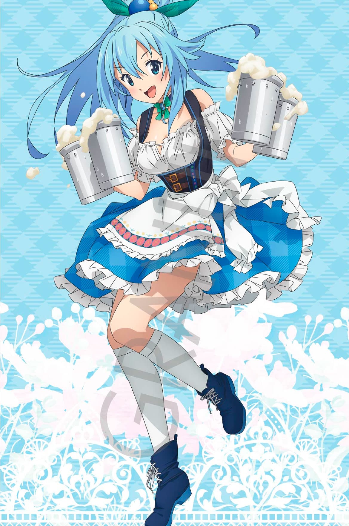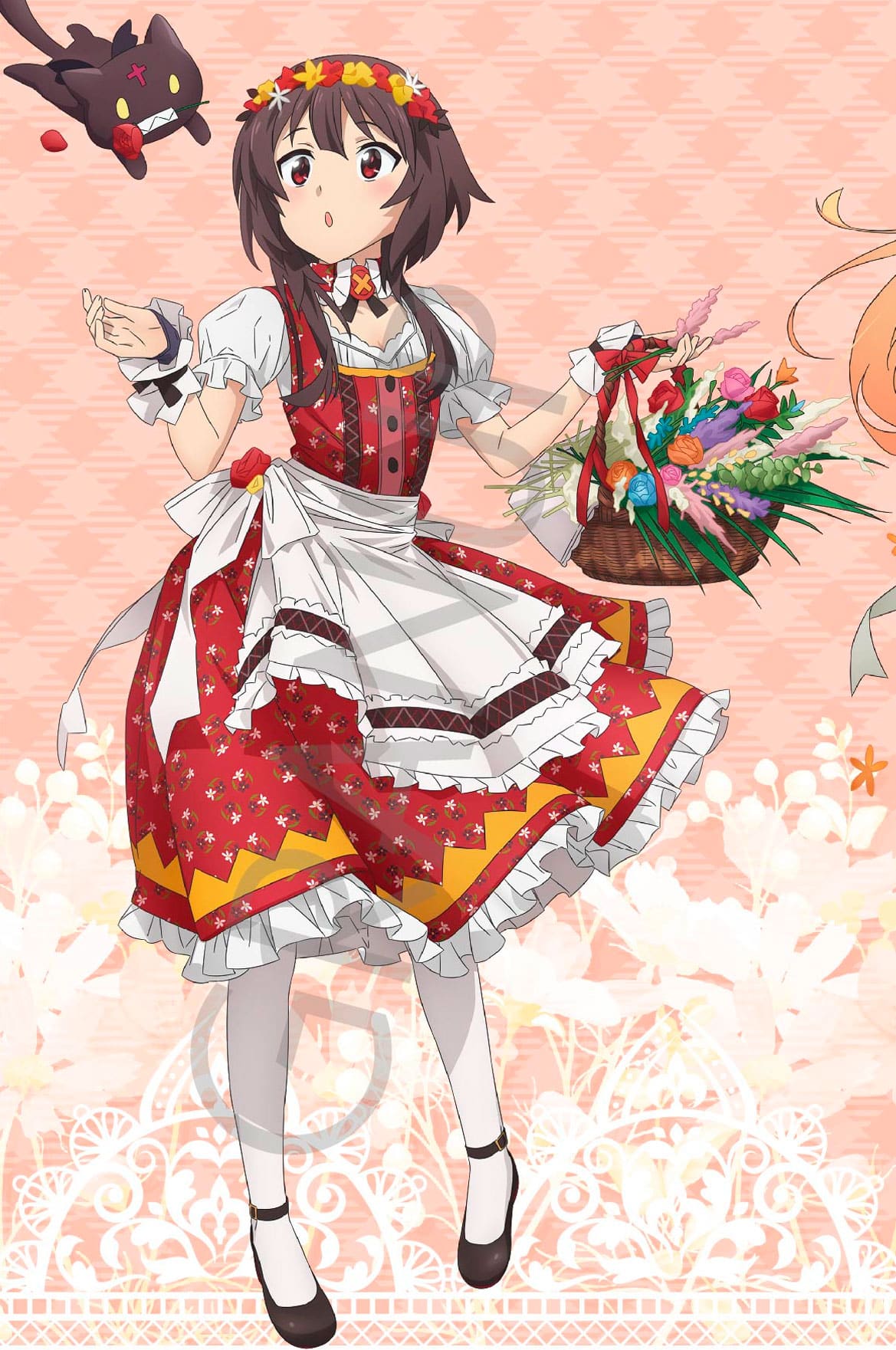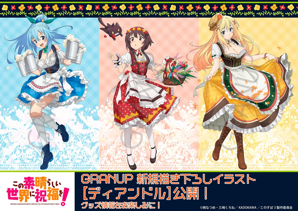 En la imagen promocional presentada por la compañia GRANUP, podremos ver a Aqua, Megumin y Darkness lucir unos vestidos tradicionales, junto a un delantal con diferentes dibujos en ellos, dando un toque elegante a estas queridas waifus.