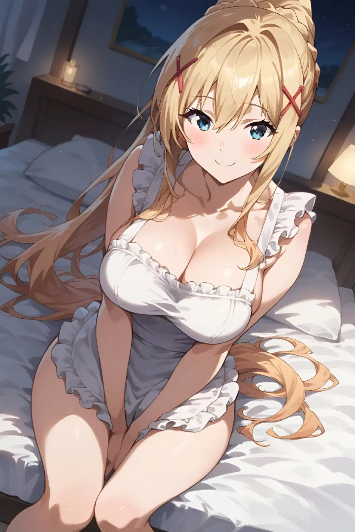 Normalmente a Darkness dentro de Konosuba! la vemos utilizando su clásica armadura de caballero, el cual siempre termina roto en la parte superior. También cada tanto se la ve con prendas diferentes, pero ahora se la retrató como nunca se la había visto. En este caso la chica se encuentra sentada en una cama, pero solamente vistiendo lo que parecería ser un delantal blanco. Con esto, y si se aprecia mejor la imagen, vemos que no hay más prendas que cubran su cuerpo, acentuando su tan voluptuosa figura. Gracias a esto serán varios los fanáticos que adoren esta ilustración.