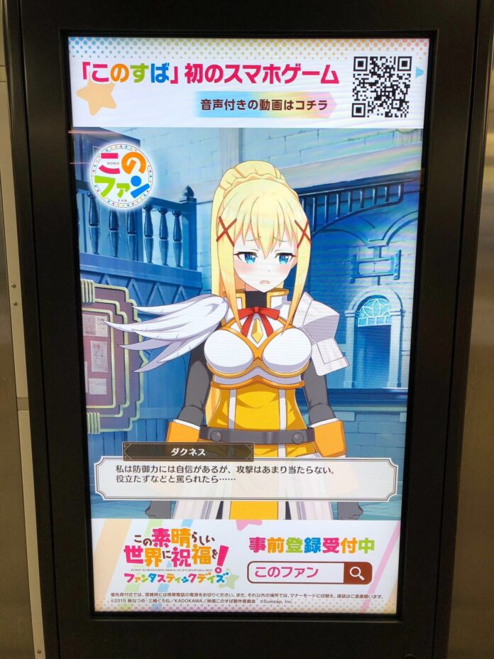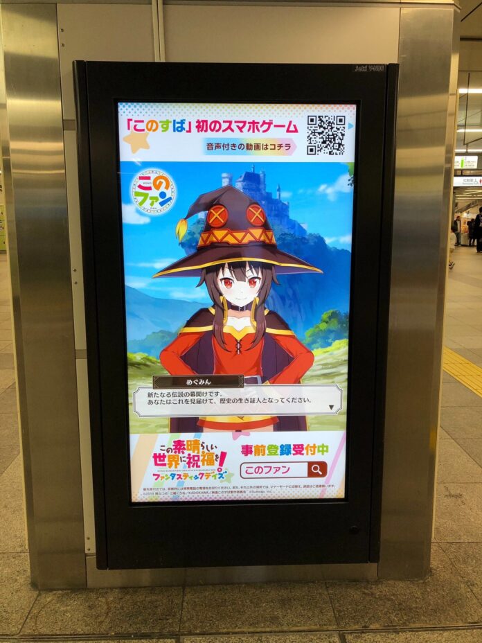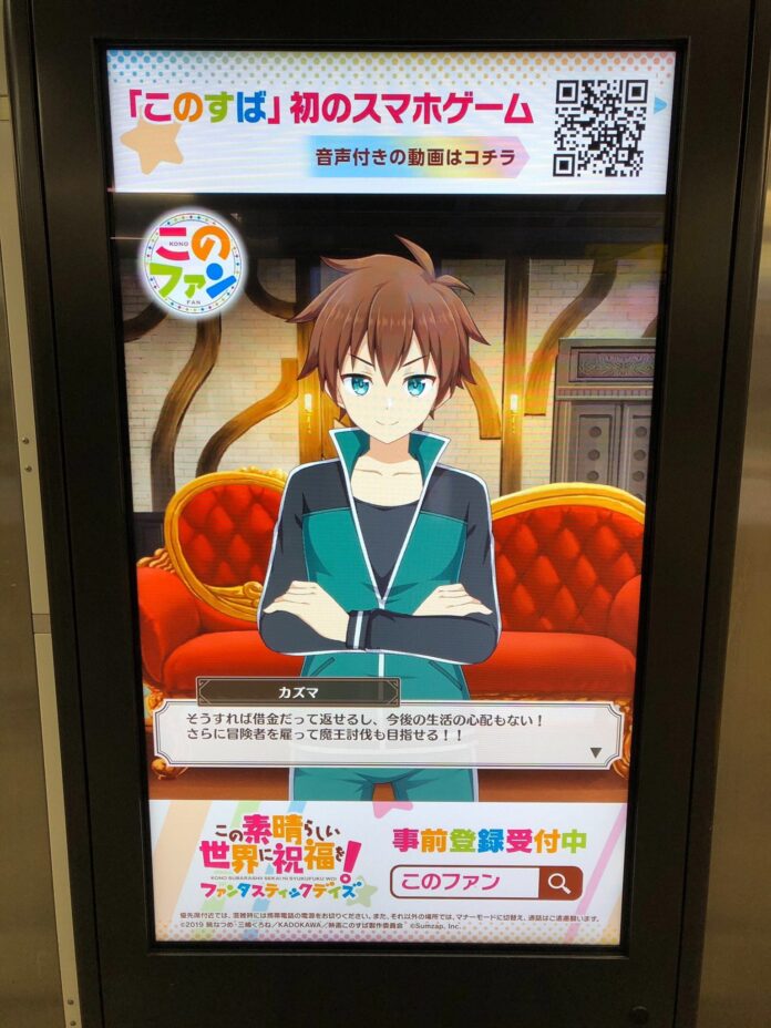 Para celebrar el próximo lanzamiento del nuevo videojuego para Smartphone de Konosuba, titulado Konosuba Fantastic Days, se colocaron 8 carteles promocionales en diferentes zonas de la estación de metro ubicada en Akihabara.