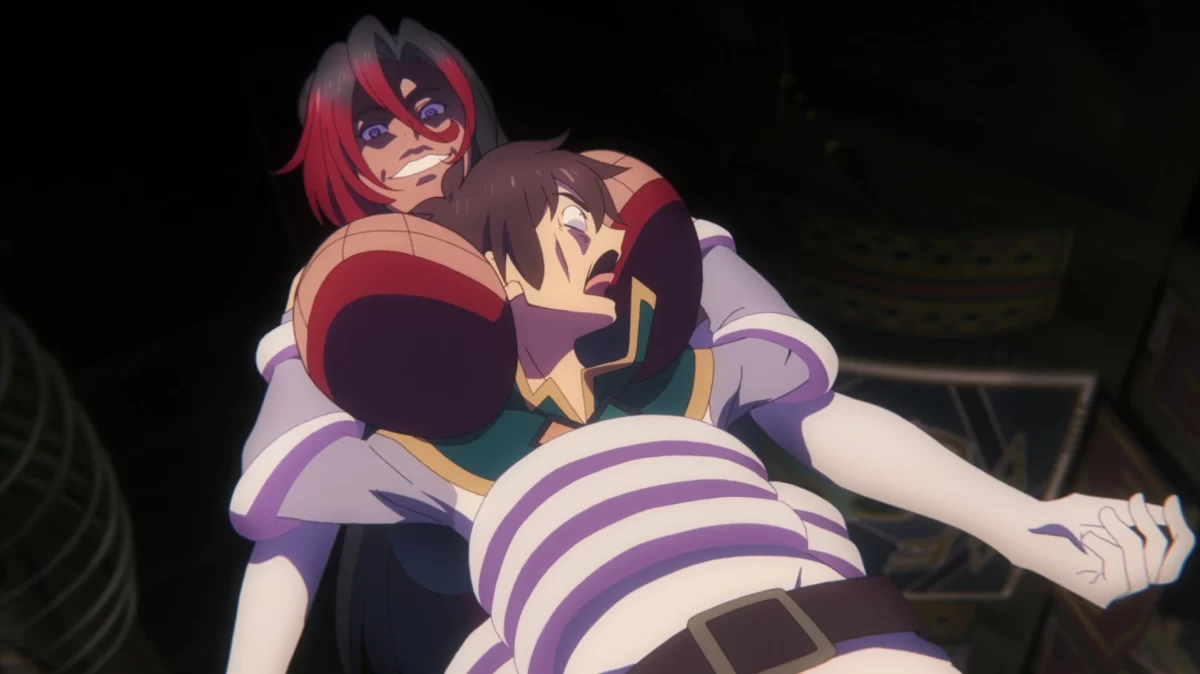 Recordemos que en un punto de KonoSuba: God’s Blessing on This Wonderful World! – Legend of Crimson, Kazuma intento unirse al lado de Sylvia por la forma en que trataba a Kazuma, pero al estar en los brazos de Sylvia, รฉl se da cuenta de que algo estรก mal, en especial cuando siente algo en la parte de abajo de Sylvia que no deberรญa estar ahรญ y es aquรญ cuando se revela que ella es una quimera, por lo tanto, su cuerpo difiere a lo que se tenรญa pensado, causando un trauma para el pobre Kazuma que hasta el primer episodio de esta temporada lo persigue.