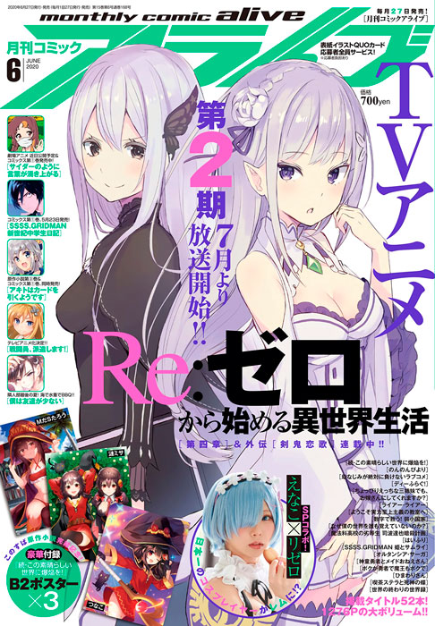 El sexto nรบmero de Gekkan Comic Alive corresponde a la ediciรณn de junio de la revista. Ademรกs la portada de la revista es protagonizada por los personajes femeninos de Re:Zero.