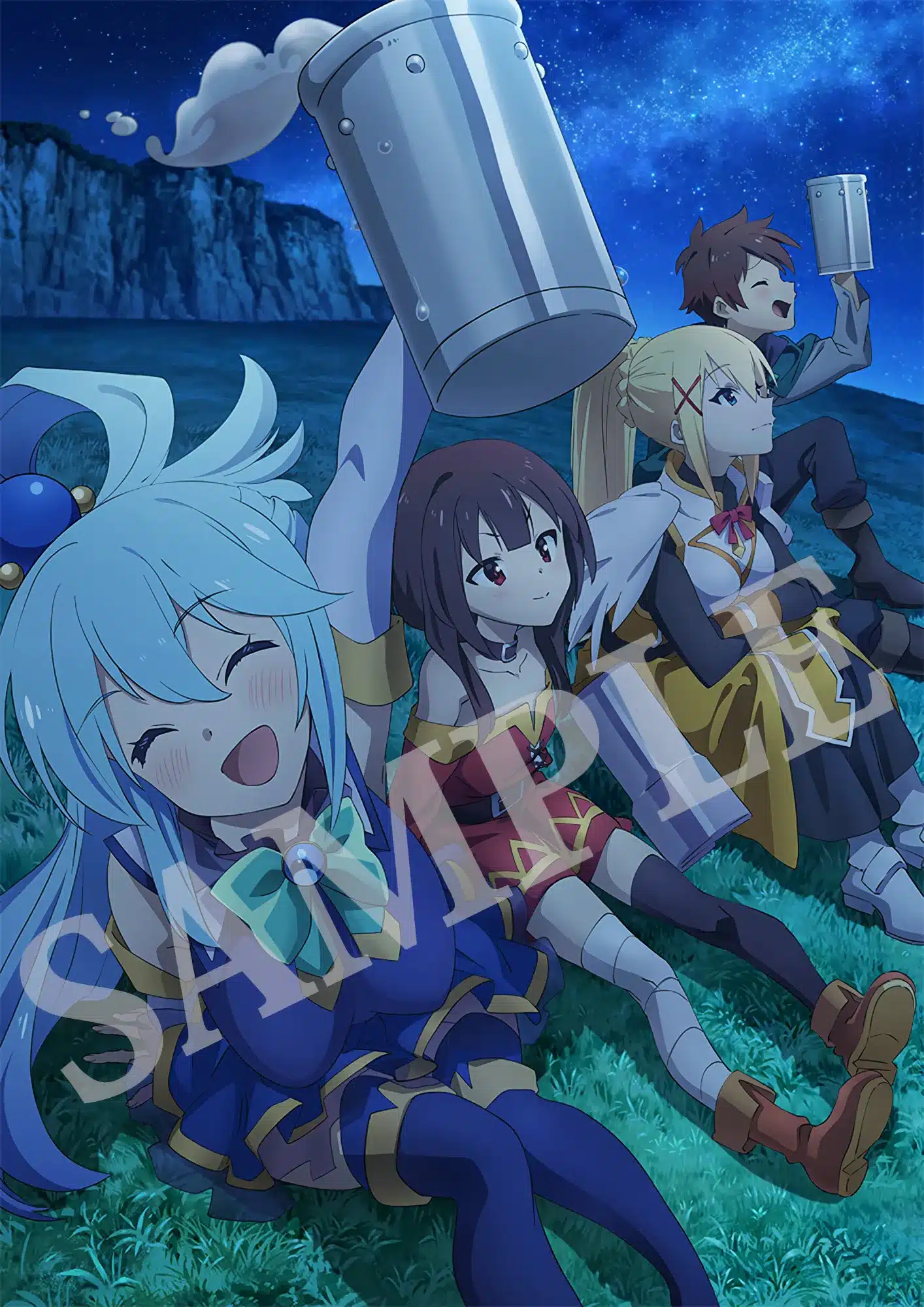 En el apartado enfocado en los volúmenes Blu-Ray/DVD de la nueva entrega del anime «KonoSuba: God’s blessing on this wonderful world!«, se han dado a conocer unas visuales especiales de los personajes Aqua, Megumin, Darkness, Iris y Kazuma, las cuales serán utilizadas para la creación de unos productos especiales que vendrán incluidos como beneficio con la compra/reserva de estos paquetes.