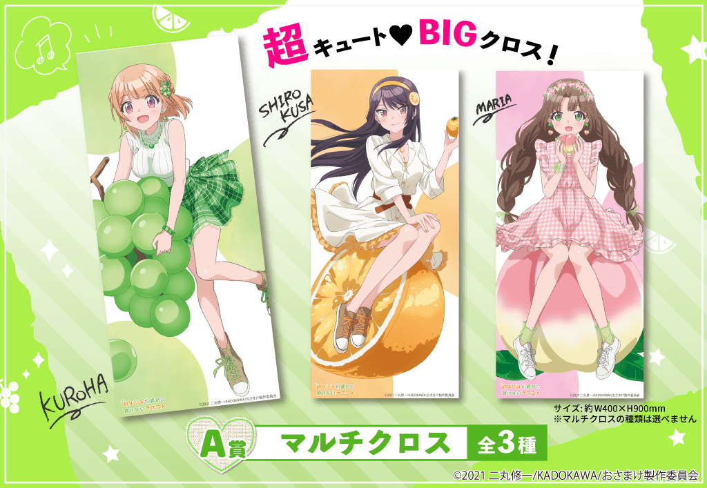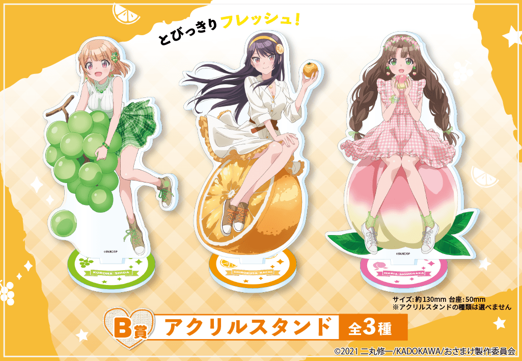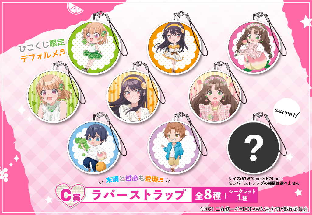Por medio del sitio web oficial de la lotería Hikokuji nos presentaron una nueva lotería en colaboración con el anime Osamake/Osananajimi ga Zettai ni Makenai Love Comedy (The Romcom Where The Childhood Friend Won’t Lose!), teniendo de protagonista una serie de ilustraciones especiales de Kuroha Shida, Shirokusa Kachi y Maria Momosaka vistiendo sus vestidos y accesosorios inspirados en frutas.
