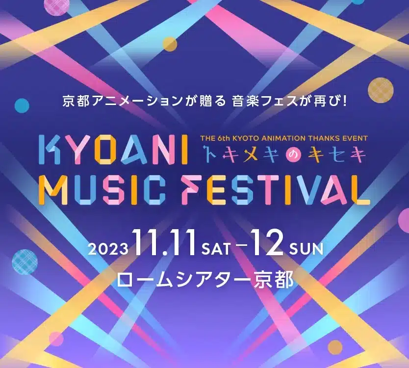A través de la cuenta de Twitter @kyoani_event, se compartió una imagen en donde se anuncia este nuevo evento llamado FESTIVAL DE MÚSICA DE KYOANI -Tokimeki no Kiseki- que será llevado a cabo los días 11 y 12 de noviembre de 2023 en Sala principal del ROHM Theather de Kioto. ras la explosión que sufrió el edificio en 2019 y la cancelación del evento en 2020 debido a la pandemia, este evento es una oportunidad única para que los fans de la animación japonesa puedan disfrutar de la música en vivo y celebrar con el estudio después de una difícil serie de acontecimientos.