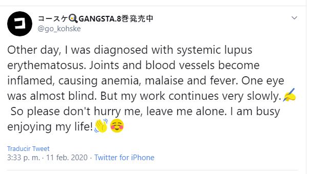 La autora del manga Gangsta, Kohske, revelรณ a traves de su cuenta oficial de Twitter que ha sido diagnosticados con lupus eritematoso sistรฉmico, una enfermedad autoinmune.