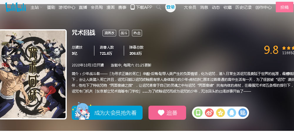 Segรบn un reporte realizado por el sitio web Yaraon!, ha revelado que la franquicia Jujutsu Kaisen esta teniendo una subida considerable de popularidad en el servicio de streaming Bilibili. La plataforma ha actualizado el ranking de popularidad de emisiones de los animes de temporada, juntando un total de 300 millones de reproducciones en total en la plataforma, Teniendo una calificaciรณn 9.8 de 10 segรบn la opiniรณn de 110 mil usuarios registrados en la plataforma.