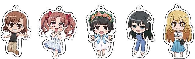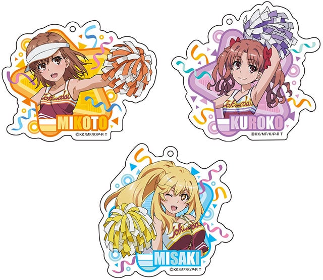 Llaveros de acrílico de Mikoto, Kuroko y Misaki con unas dimensiones de 70mm x 70mm, cada uno por 800 yenes.