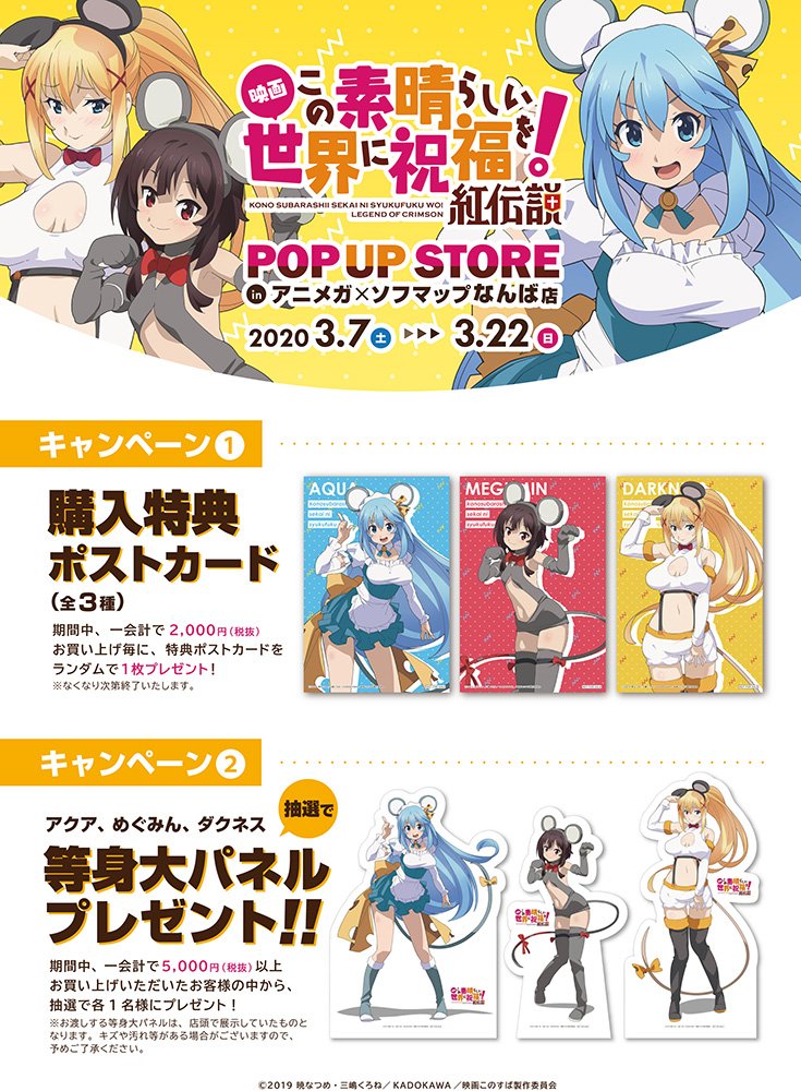 La tienda Sofmap anunció una colaboración con la película Konosuba: Legend of Crimson para ofrecer productos inspirados en las protagonistas del anime.