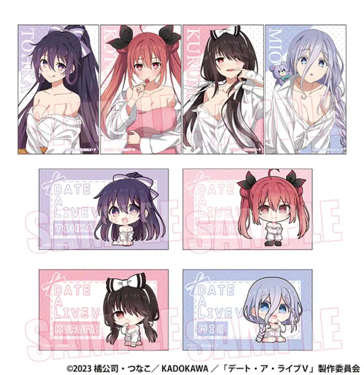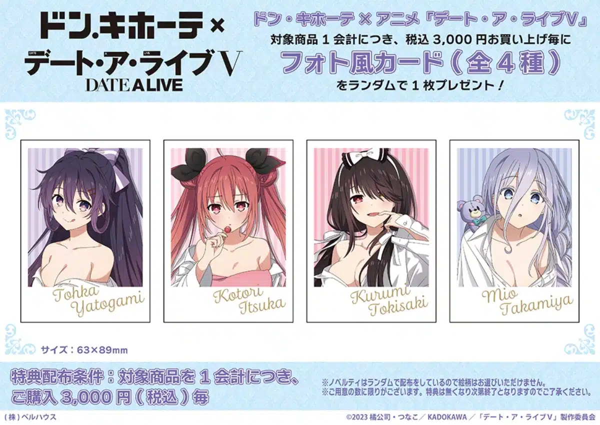 Como parte de una colaboración con la cadena de tiendas de descuentos japonesa Don Quijote, la franquicia Date a Live lanzará una nueva serie de productos. Estos se destacan por su diversidad, ya que son varias las piezas de colección que los fanáticos podrán adquirir. Entre ellos nos encontramos con llaveros, insignias de chapa (individual o en caja de ocho), soportes acrílicos pequeños y grandes, dioramas, pegatinas y afiches. También existirá una tarjeta fotográfica especial por cada 3000 yenes gastados.