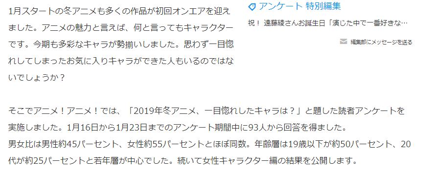 En celebración por la temporada anime invierno 2019 un portal japones realizo una encuesta a sus fans. La pregunta realizada fue «¿Cual fue el personaje que amaste a primera vista?«, del 16 al 23 de enero los fans pudieron responder a la pregunta.