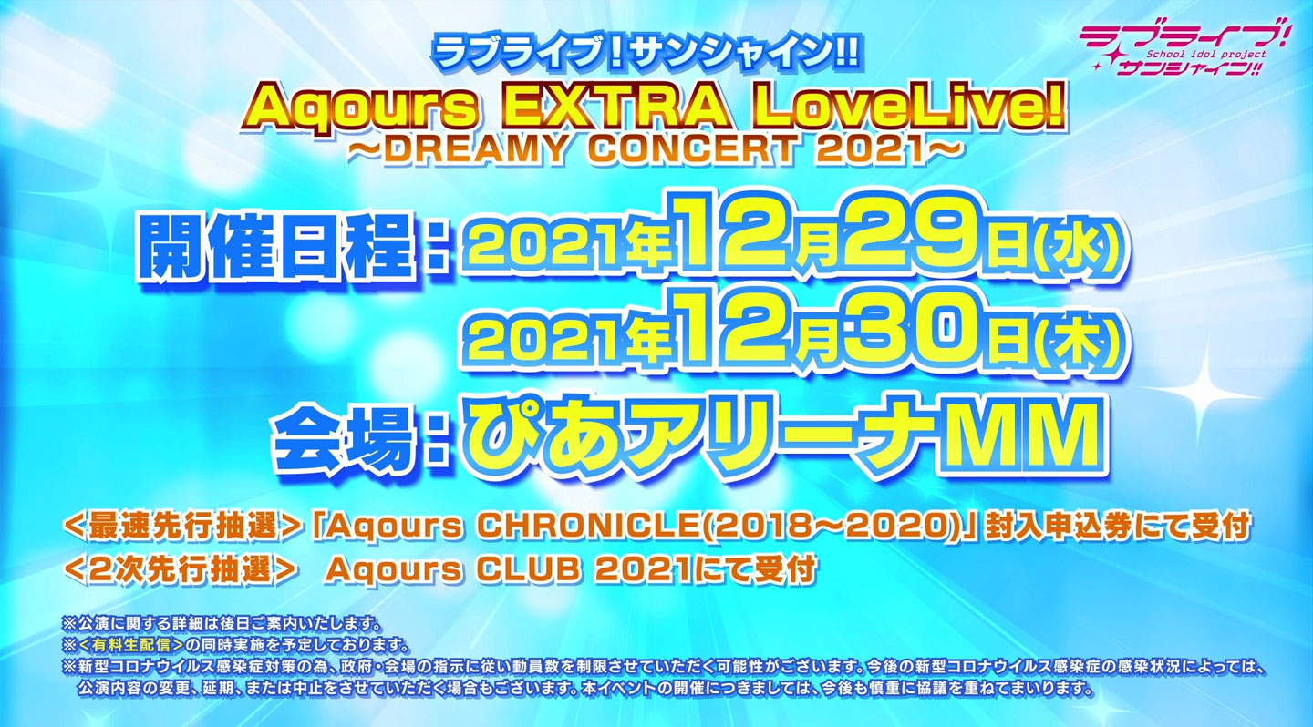 Adicionalmente, se anunció que la agrupación Aquors de Love Live! Sunshine realizarán un concierto titulado «Aquors Extra LoveLive! ~Dreamy Concert 2021~» el 29 y 30 de diciembre en el «Pia Arena MM«. Este concierto también contará con una transmisión en vivo que se realizará en una plataforma de pago.