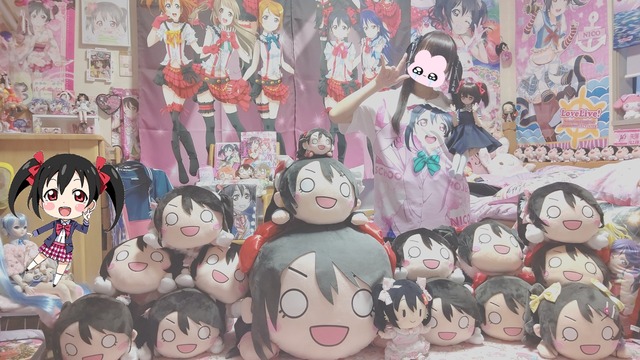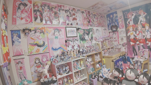 Las fotos que compartió la joven japonesa son de su habitación y sorprenden por estar tapizadas todas las paredes con Nico y otras miembros de Love Live; además de tener una gran colección de peluches chibi, dakimakuras, carpetas, figuras, etc.