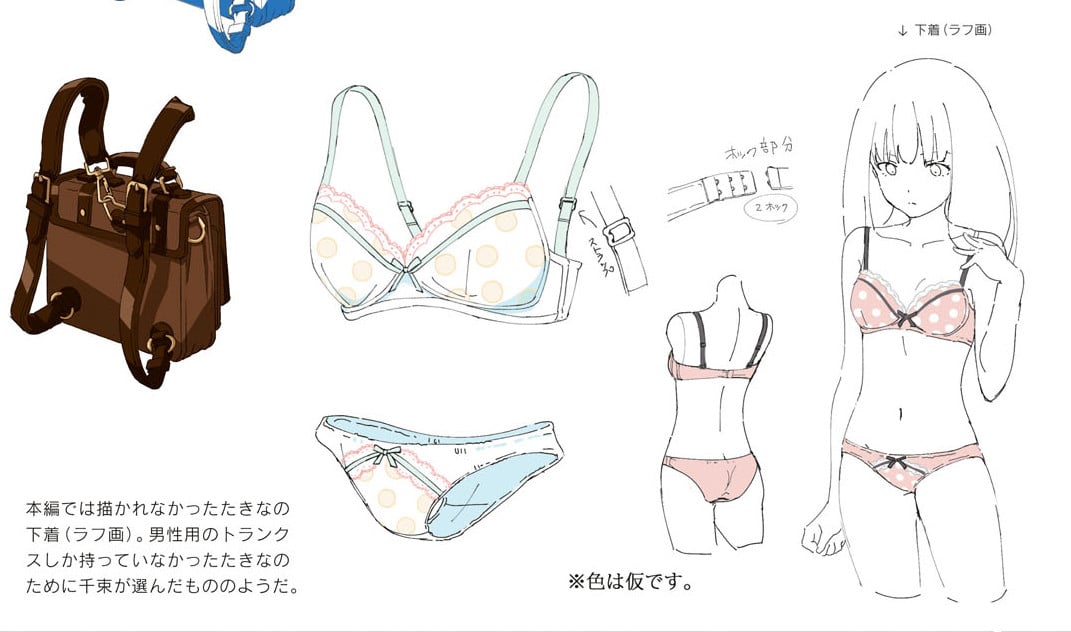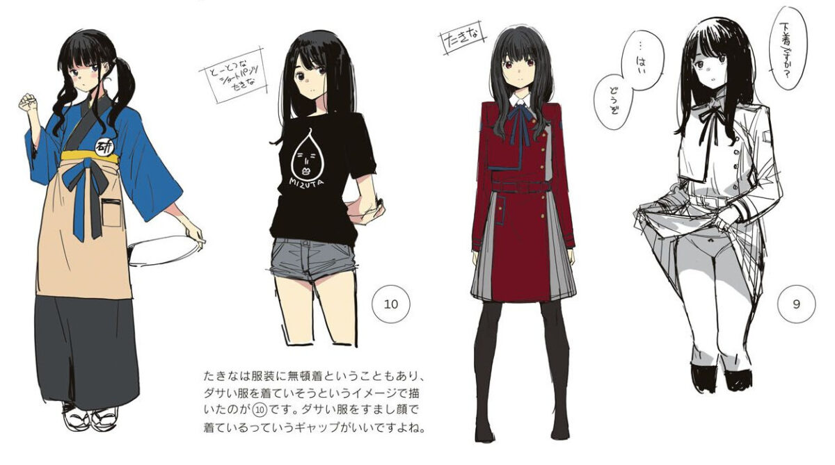 En los bocetos del libro de ilustraciones se muestra que la ropa interior que compró Takina consta de un juego de sostén y bragas en color rosado, con el detalle de un moño en el frente. Además, también se pueden observar algunos otros bocetos de atuendos del personaje que son realmente lindos.