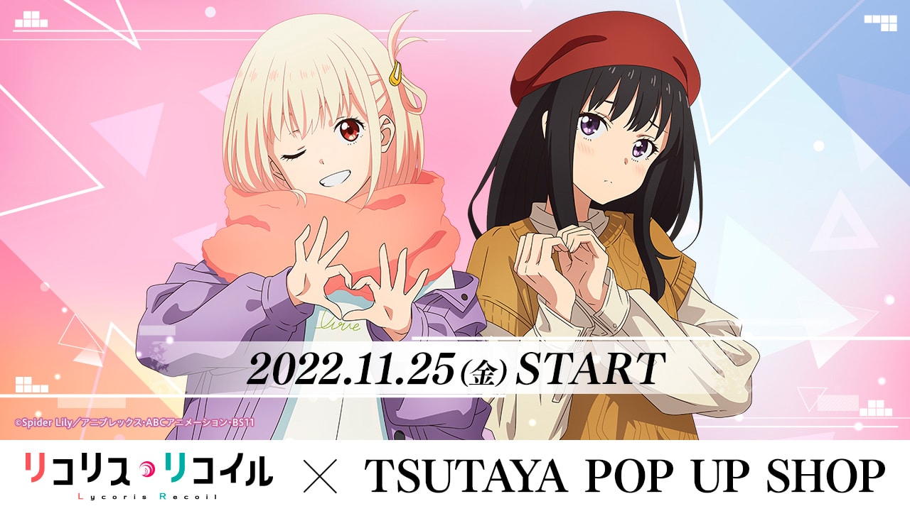En los medios oficiales de la compañia TSUTAYA se ha presentado una colaboración especial con el anime original «Lycoris Recoil» y consistirá en la producción de algunos productos inspirados en los personajes Chisato Nishikigi y Takina Inoue, quienes lucirán unas vestimentas fabulosas para pasar un día juntas en un día normal. Además, la compañia TSUTAYA confirmó que la colaboración con el anime Lycoris Recoil comenzará a partir del próximo 25 de noviembre y publicó una imagen promocional.