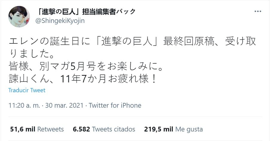 El pasado 30 de marzo, el mismo día del cumpleaños de Eren, el editor encargado de la serie anunció a través de su cuenta de Twitter que ya tenía en sus manos el manuscrito del episodio final y agradeció por el arduo trabajo del autor en este proyecto.