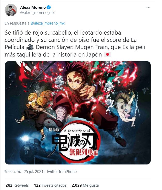 La publicación dice lo siguiente: «Se tiñó de rojo su cabello, el leotardo estaba coordinado y su canción de piso fue el score de La Película 🎥 Demon Slayer: Mugen Train, que Es la peli más taquillera de la historia en Japón».