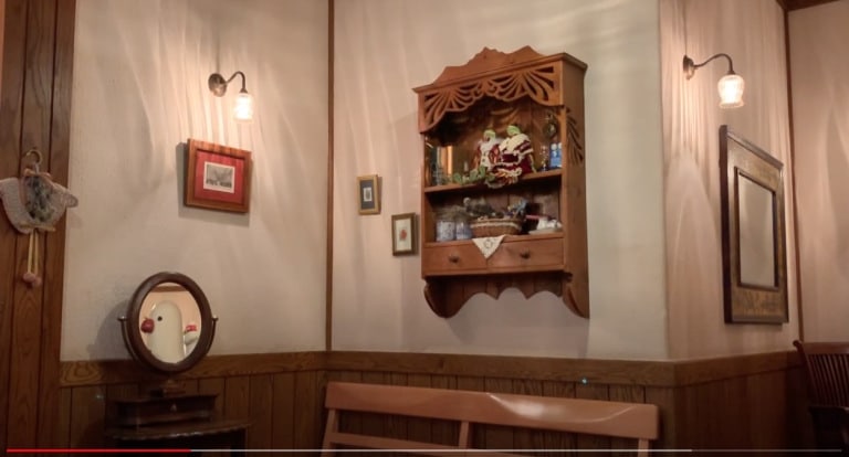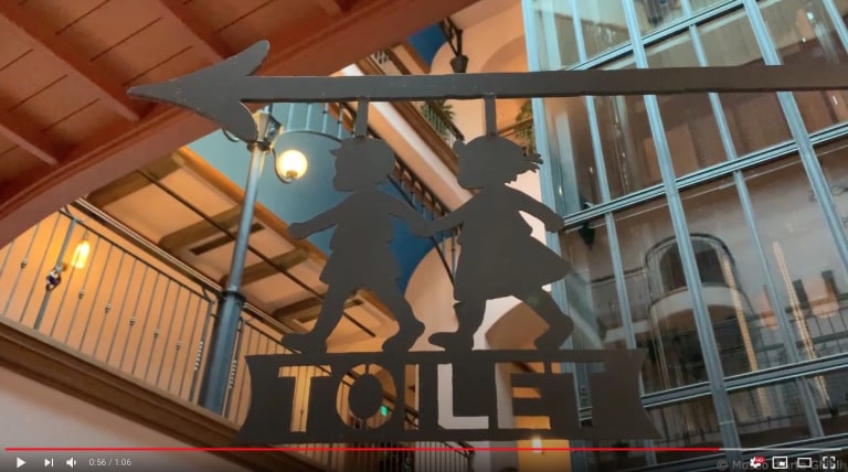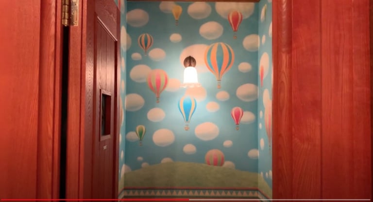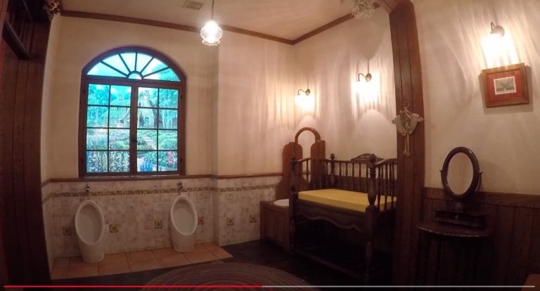El baño que aparece en el video es el baño de mujeres en la planta baja del museo. Al entrar, se ve un hermoso panel de ventana arqueada frente a una imagen de Ghibli iluminada que muestra a Kiki del Servicio de Entrega corriendo por el jardín y hacia su casa. Debajo de la ventana hay dos urinarios para niños y al lado, un lavabo para niños y una mesa para cambiar pañales.