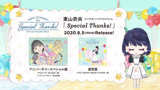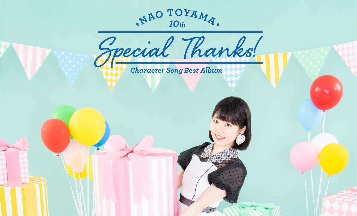 Como se informó, la actriz de voz Nao Toyama lanzará una canción de dos discos con el mejor álbum «Special Thanks!» el 5 de agosto de 2020, como parte de su proyecto décimo aniversario de su debut. Para celebrar el lanzamiento, transmitirá en vivo un programa web especial en su canal oficial de YouTube a las 21:00 el día del lanzamiento (JST) / 03:00 el 5 de agosto (PT). Ella aceptará mensajes de los fanáticos con el hashtag # な お ぼ う キ ャ ラ ソ ン ベ ス ト en Twitter.