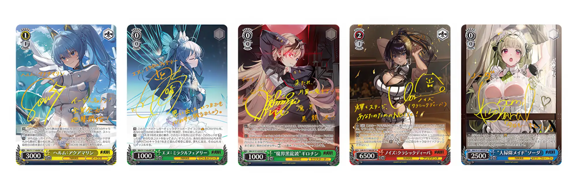 Una de las novedades más destacadas de este lanzamiento es la inclusión de cartas con nuevas ilustraciones, algunas de las cuales contarán con los autógrafos de las actrices de voz japonesas que dan vida a los personajes de Nikke. Además, algunas cartas de rareza superior (SEC+ y SSP) presentarán ilustraciones completamente nuevas realizadas por los artistas del juego. Las cartas SP (Especiales) incluirán autógrafos impresos de 38 miembros del elenco de voces.