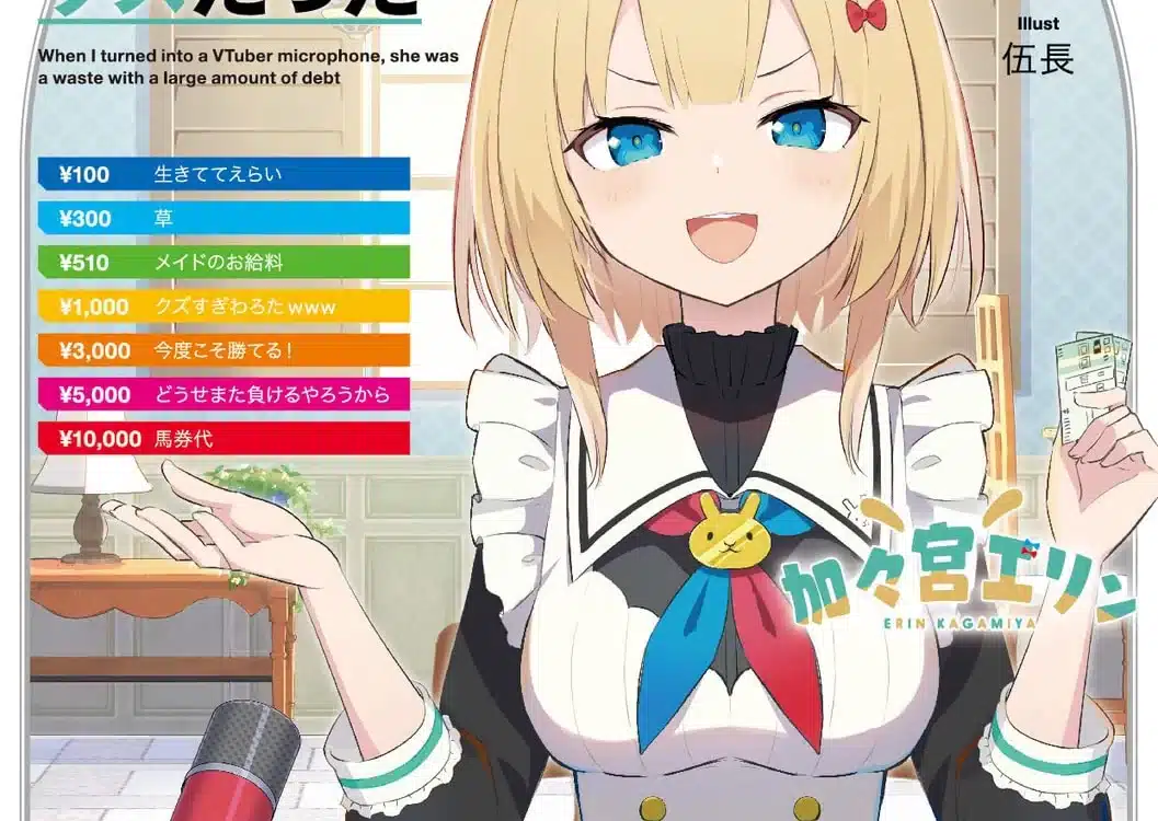 Publicada el 1 de junio de 2022, esta novela ligera narra la historia de un personaje que se convierte en el micrófono de la popular VTuber Erin Kagamiya. Aunque al principio parece ser una emocionante oportunidad para escuchar la voz de su ídol favorita, pronto se enfrenta a la dura realidad, ya que descubre las deudas y la obsesión por el juego de Erin. Y además descubre, que va a pagar sus deudas con las donaciones de sus fans, lo que plantea interrogantes sobre la validez de la fantasía.