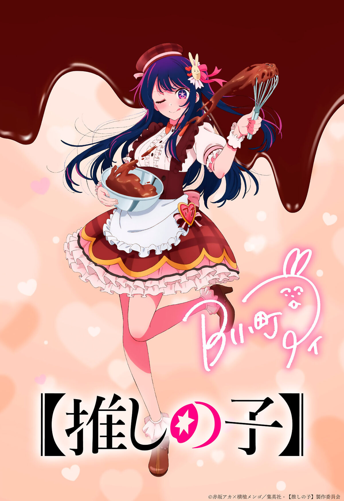 La ilustración muestra a Ai Hoshino, un personaje encantador y alegre que, desde los 12 años, se ha dedicado al mundo del espectáculo como ídolo. En la imagen, se puede ver a Ai luciendo un delantal de cocina mientras prepara deliciosos chocolates para celebrar el día de San Valentín