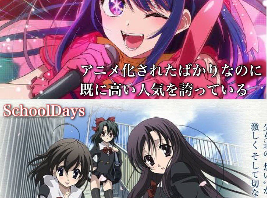 El usuario de Twitter @nenesamagatizei compartió recientemente una comparación entre Oshi no Ko y School Days, remarcando algunos puntos que ambos animes tiene en común. Esto después de que fuera tendencia la comparación entre estos animes durante los últimos días.